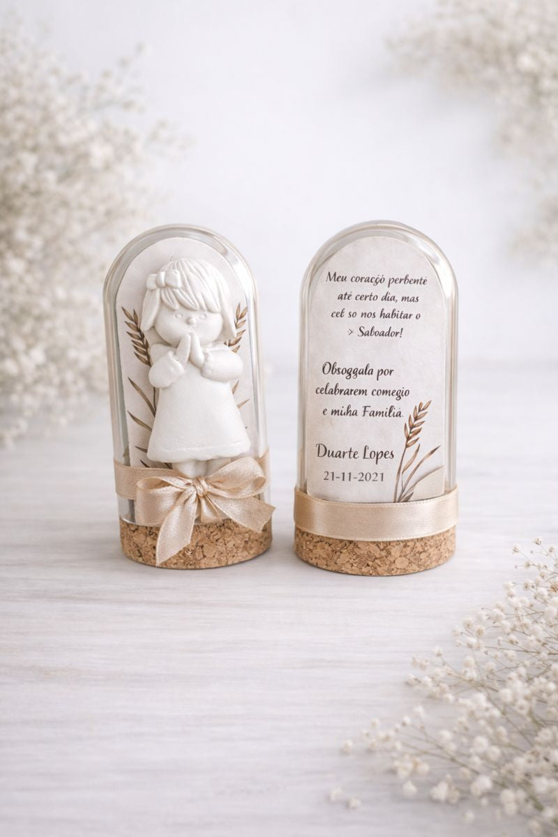 As nossas cúpulas em vidro com figura decorativa e mensagem personalizada adaptam-se a qualquer ocasião — batizados, comunhões, aniversários, bodas ou simplesmente para oferecer com significado.