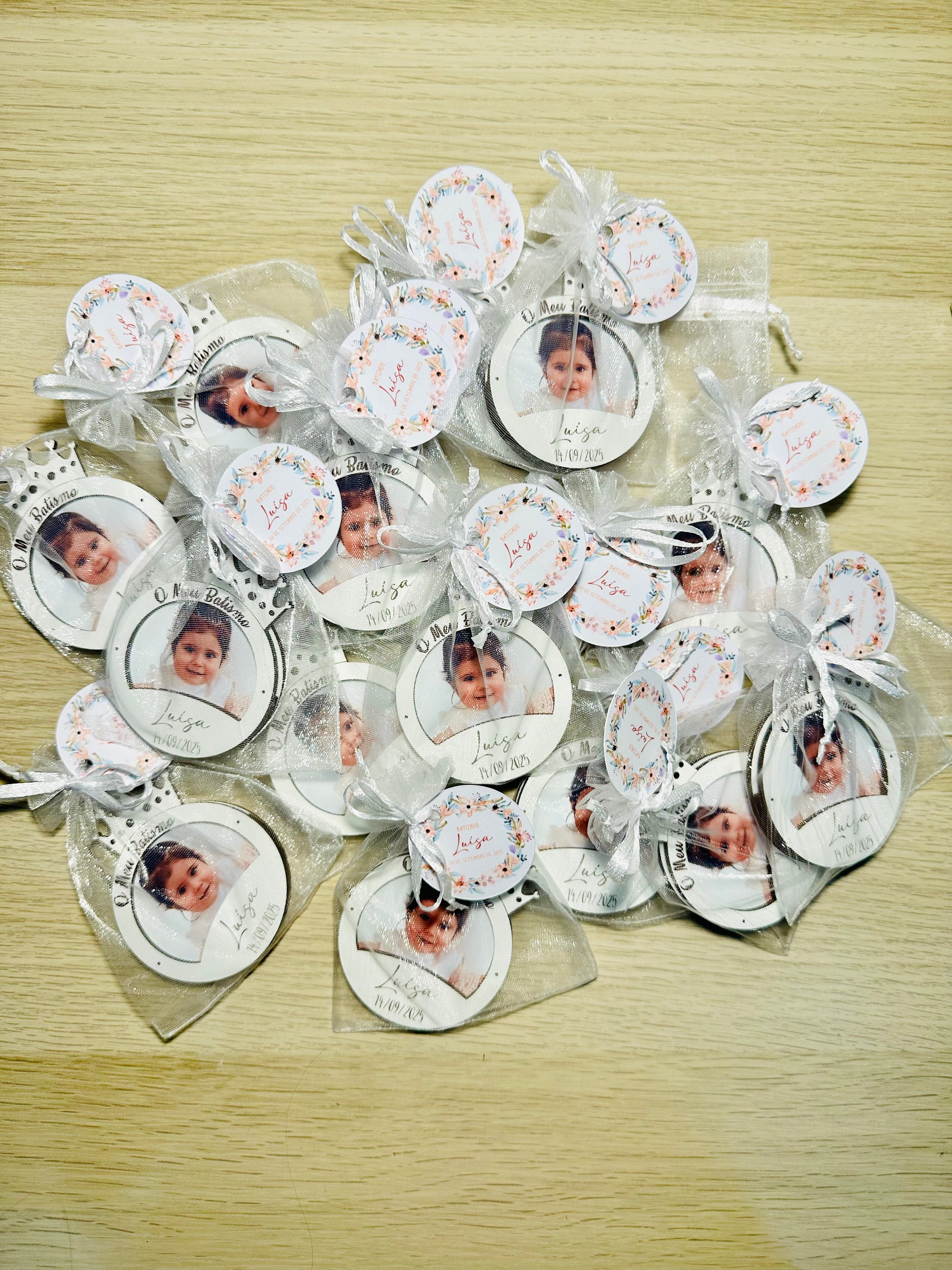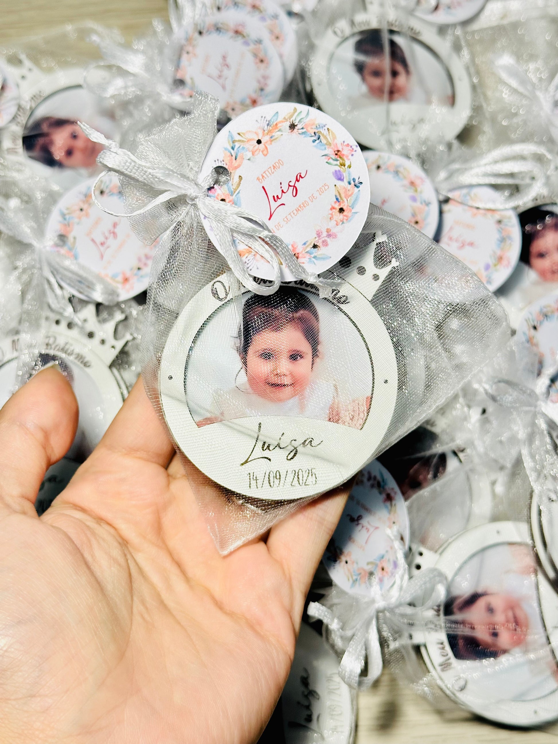 Inclui a fotografia da criança, o nome e a data do grande dia. Ideal para oferecer a familiares e convidados como recordação única e especial.