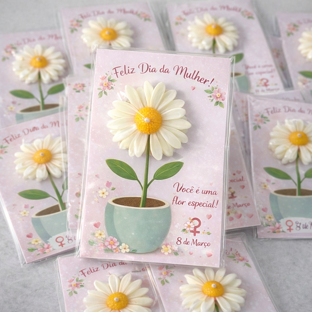 Esta lembrança é composta por uma flor em gesso perfumado aplicada num cartão personalizado com a mensagem “Feliz Dia da Mulher!”. Um miminho especial para oferecer a colaboradoras, clientes, professoras, amigas ou para surpreender as mulheres mais importantes da sua vida.