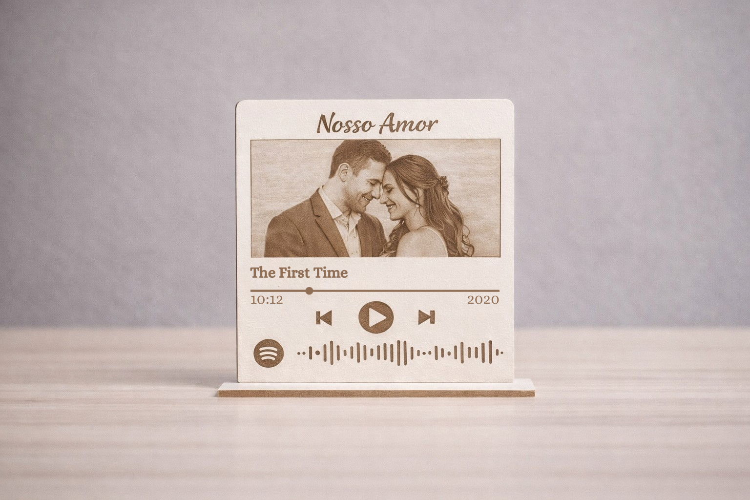 Inclui a fotografia do casal gravada a laser, o nome da música, detalhes do player e o código visual da onda sonora, tornando-a perfeita para oferecer em datas especiais como aniversários, Dia dos Namorados, casamentos ou momentos inesquecíveis.