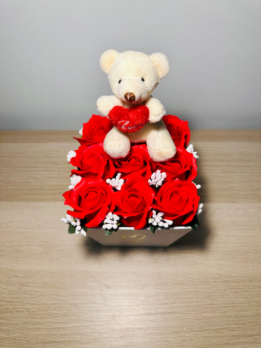 Cesta Rosas e Urso Castanho